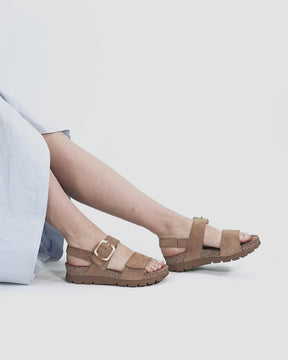 Flat woman's sandals. Natural suede. Velcro Closure. Leather lining. Anatomical insole. Lightweight, flexible, strong cork and EVA rubber sole. Heel height: 4.5 cm. 100% Made in Spain.
