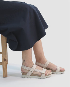 Flat woman's sandals. Natural Napa Leather. Velcro Closure. Leather lining. Anatomical insole. Lightweight, flexible, strong cork and EVA rubber sole. Heel height: 4.5 cm. 100% Made in Spain.
